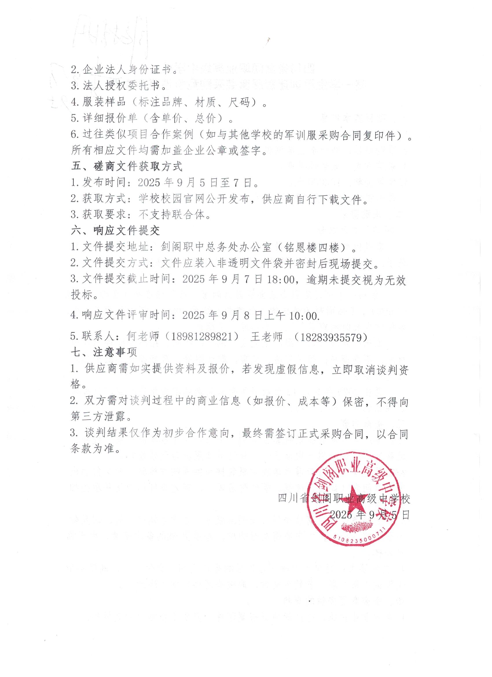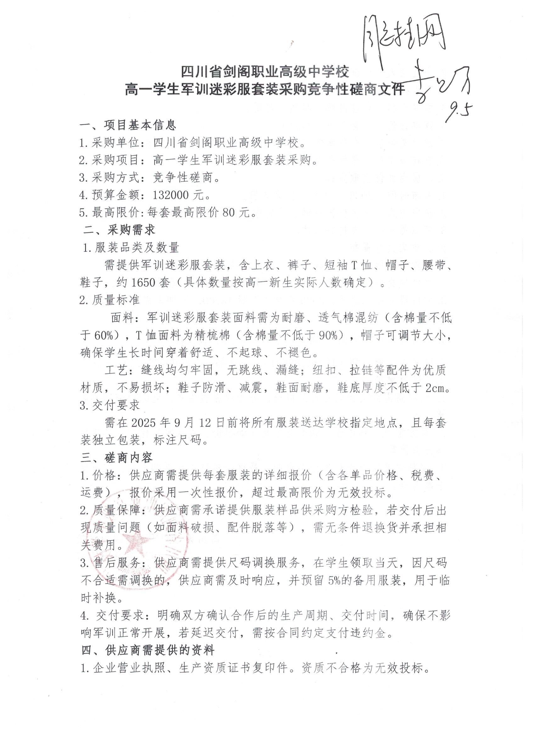 四川省剑阁职业高级中学校高一学生军训迷彩服套装采购竞争性磋商文件