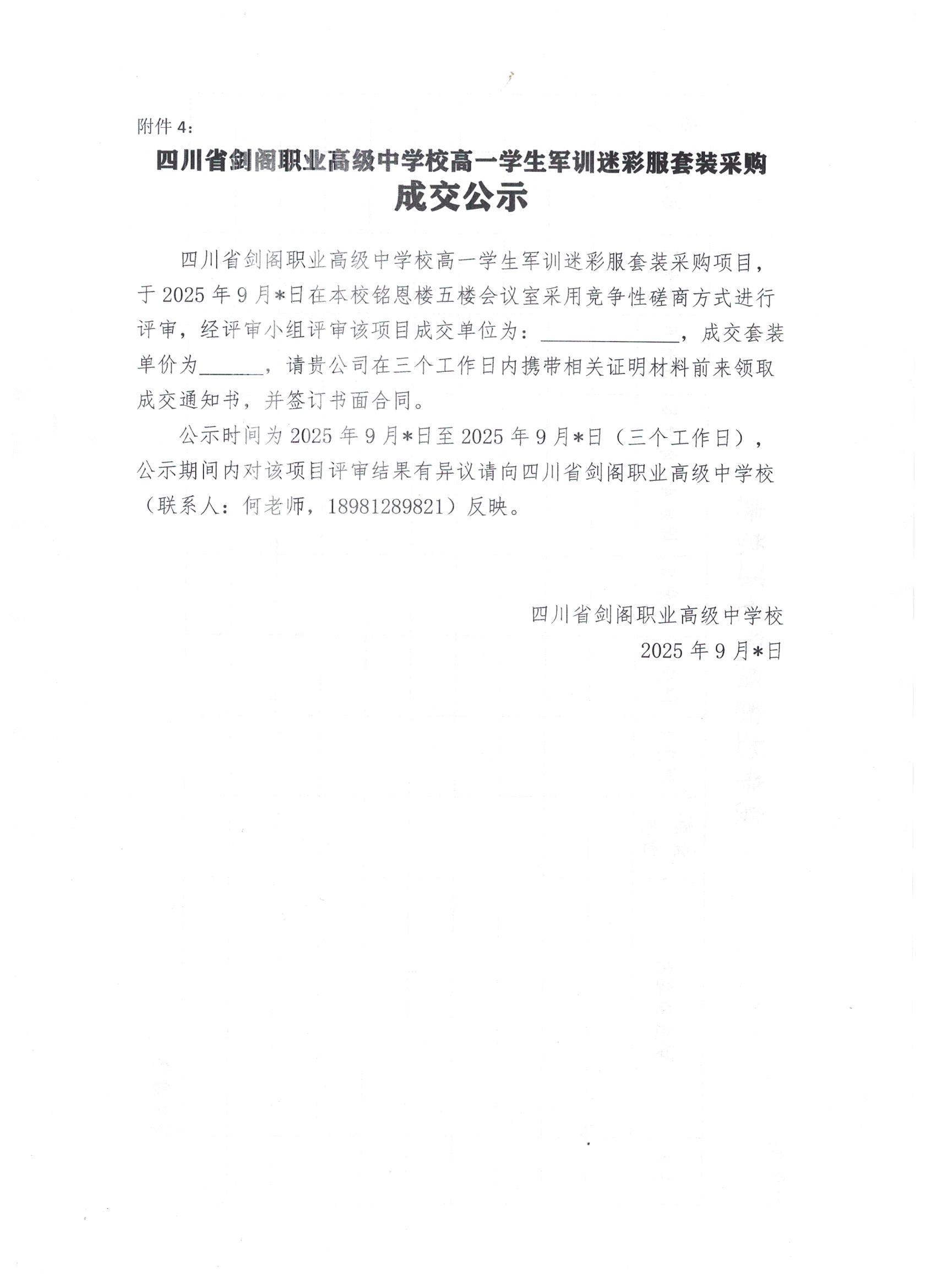 四川省剑阁职业高级中学校高一学生军训迷彩服套装采购成交公告