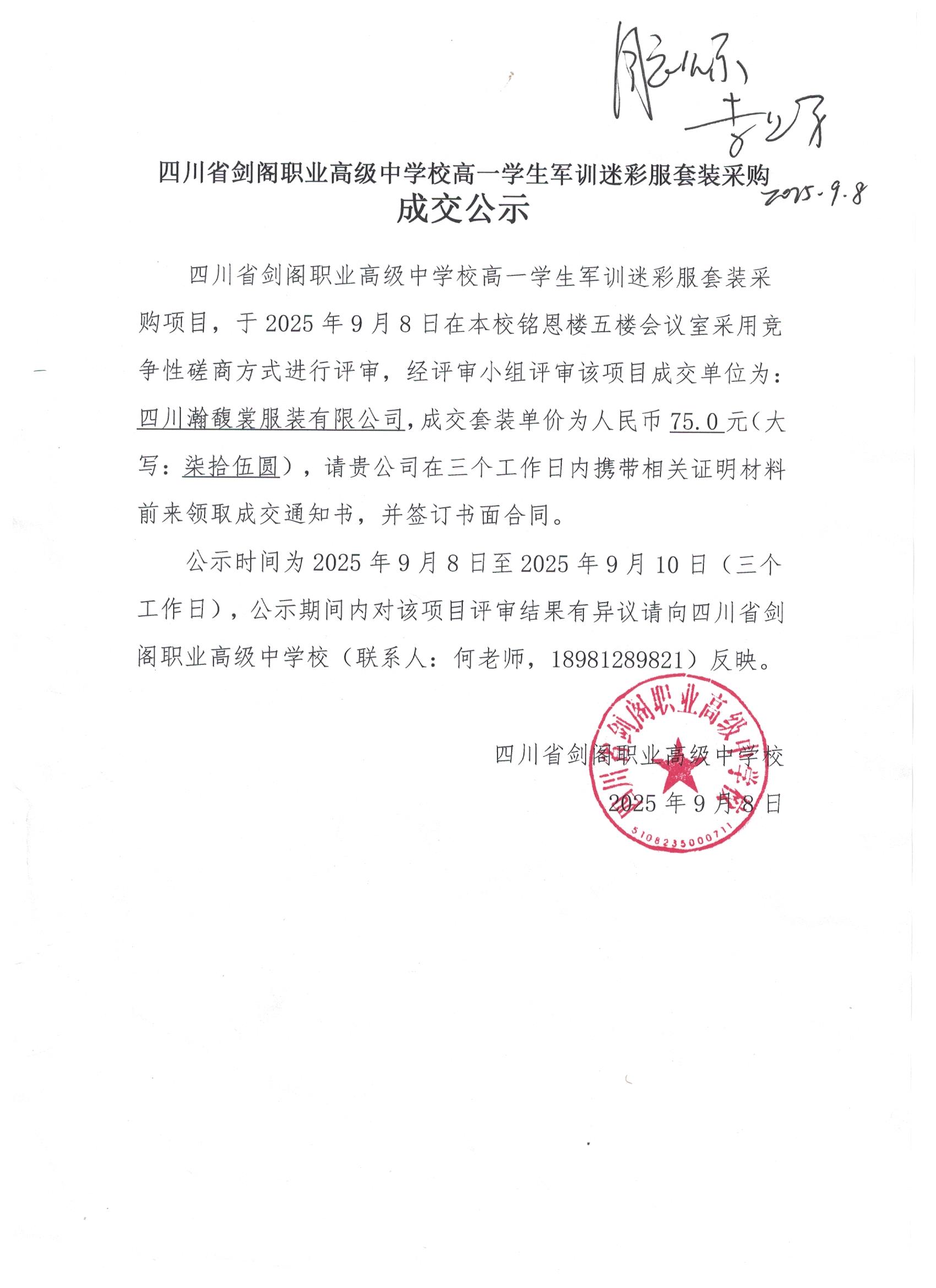 四川省剑阁职业高级中学校高一学生军训迷彩服套装采购成交公告